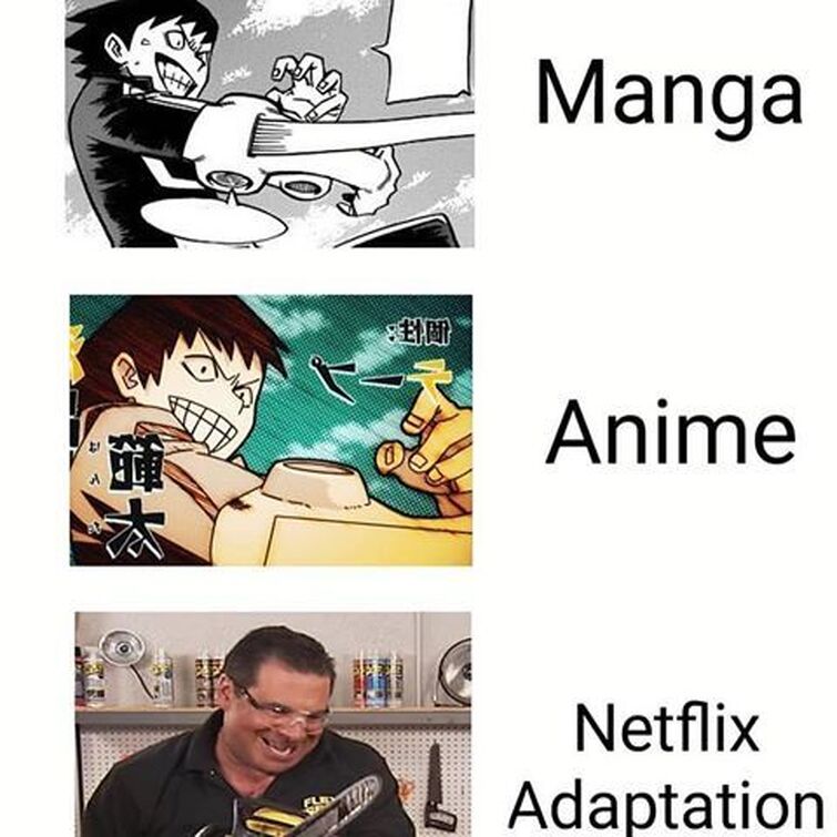 Netflix adaptation refers to images mocking netflix adaptations of anime and manga series, centering the joke on how the adaptations tend to change characters for the worse with poor design the final panel, labeled netflix adaptation, features and a picture of a black person wearing a wig. This includes edits that only provide a reaction to or summary of the initial media; Manga anime netflix adaptation edition anime memes only true fans will find funny as the title suggest this video is all manga. But netflix still promotes them and slaps a big old the new title for the adaptation is kanojo (she).kiko.